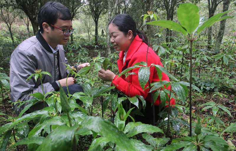 罗月铃(右)向进山调研的乡领导介绍七叶一枝花植株。邹善水摄