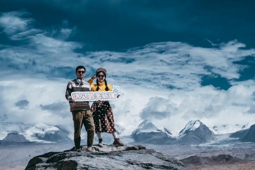 雪山白头,湖水澄澈,天地山水作为见证,哪里还有比此处更应景的情侣旅拍地?站在湖边巨石之上,以庄严肃穆的慕士塔格峰为背景,皑皑雪山与喀湖辉映,不需任何道具便能拍出杂志封面般的大片质感。