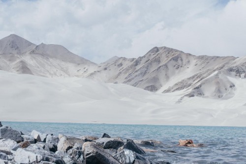 而在喀湖旁边,不知何处而来的白色沙丘绵延数十公里,静静依偎在喀湖之滨,堪称高原之上的神来一笔,为雄浑的帕米尔高原点缀出“一半海水,一半沙漠”的奇景。
