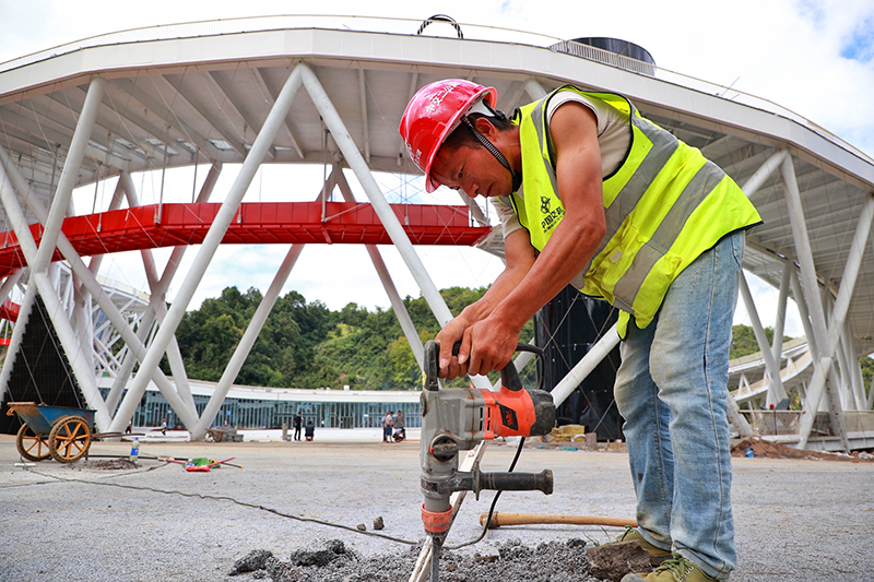 8月15日,工作人员在第四届绿博会主场馆外施工。