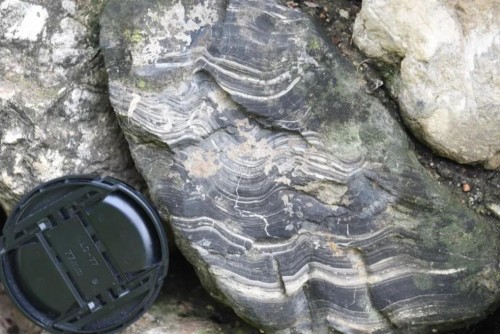 这次是沿着河滩的方向找寻,在破碎、磨圆的转石中,以及老乡家用石块砌筑的院墙上陆续发现了一些算不上典型但可以确认的叠层石,似乎也不大新鲜,但似乎有峰回路转的迹象。终于见到了大量散布的叠层石样品,特别是发现了一块足有0.5立方的漂亮叠层石,OK!没错了就是它。