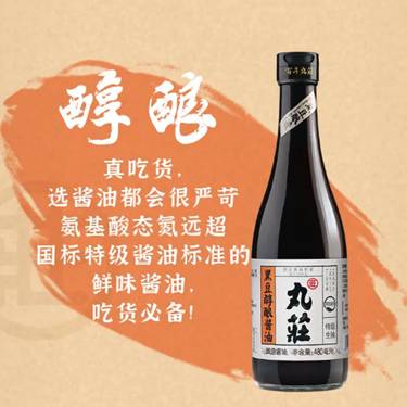 丸庄黑豆酱油传承百年工艺,精研菌种和酿造技术,酿造的酱油入口鲜香,口感醇厚,回味绵长,自然回甘,“六味"齐备均超过国家特级酱油标准。快来pick一均超过国家特级酱油标准。快来pick一款你喜欢的口味吧!