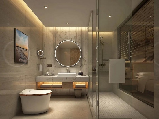 盥洗区功能细节:音乐播放器(蓝牙)、美颜镜(带美颜灯光功能)、护发吹风机带搁架、隐藏式手机搁架、定制智能马桶 (感应开盖)、静音通风除异味设备、智能卫浴系统、中空夹层百叶窗自如开合自如升降......
