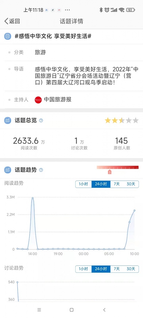 据统计,本次活动受到广大网友的关注,活动话题超2600余万人次阅读,1万余人次参与话题评论,直播视频观看量30分钟超25万人次。中国旅游日活动期间,恰逢辽宁旅游消费黄金旺季。各地纷纷推出多种形式的旅游惠民措施和丰富多彩的活动,包括发放文旅消费券;旅游企业推出免费、打折等优惠措施;旅游助老、助残措施;对抗疫工作者、劳动模范等先进群体的优惠措施;公益性文艺演出、公共文化场馆扩大开放等文化惠民措施,相关信息通过网站、新媒体等平台动态发布。