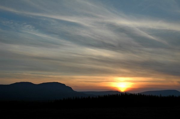 高耸的群山挡住了夕阳,我们一度以为满心向往的天空岛日落就此遗憾收场了。可就在一块豁然开阔的平缓之地,远处一片茂密森林的后面,迟迟不肯退到山后的夕阳,似乎正在等待我们的前来。一场惊心动魄的日落上演了。我们瞠目于辉煌的天幕,过分饱和的色彩将光芒染指之处都变得异常壮丽,我们忘记了时间的游走,惊叹于大自然的神来之笔,恋恋不舍,直到那轮火球完全隐入山后。最高潮的一幕竟然是日尽之后,霞光与云雾的杰作,让那红有了深深浅浅的不同,犹如情人之间惜惜送别,缠绵不绝。