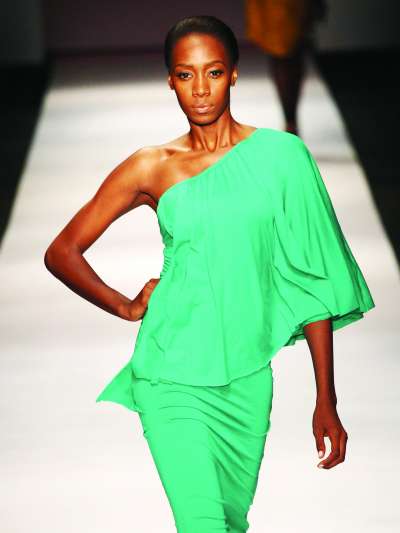 2012南非 Joburg(秋冬)时装周作品,模特身穿松石绿单肩礼服,虽然只采用单一色调,但剪裁非常精致。