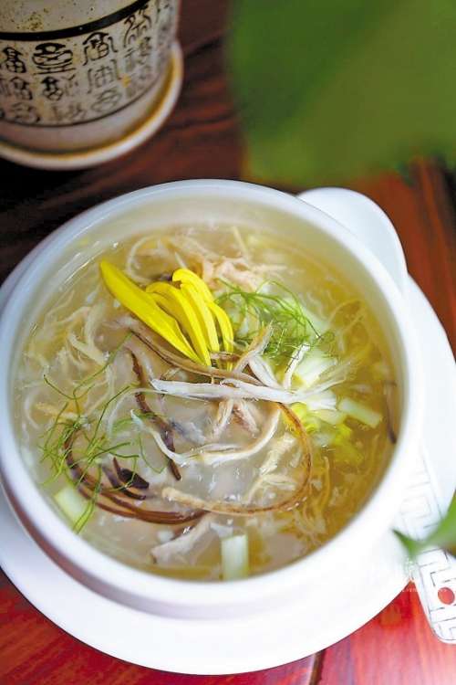 而另一派则比“蛇窝”的历史要久远得多,就是蛇菜的千年代表“蛇羹”。论到把“蛇羹”发扬光大的,莫过于江太史。江太史家的“五蛇羹”其讲究之处可说一时无两,蛇是金环蛇、银环蛇、眼镜蛇、水蛇、锦蛇,浸熟或蒸熟蛇身后,撕成肉丝,加入鸡肉丝、果子狸肉丝、鲍鱼丝、广肚丝、冬菇、木耳、生粉、菊花制成蛇羹。佐料有薄脆、柠檬叶丝、菊花瓣等。其中精细到连菊花都指定用自家种的大白菊,甚至是把珍品奇菊“鹤舞云霄”亦入于其中。加上江太史经常以此羹款待中外商人及使节官员,因此“太史五蛇羹”声名大振。到上世纪90年代,此菜已经大大简化,甚至只要有三蛇亦可成羹。