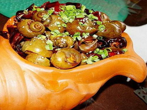 上海市的糟田螺是著名的特色风味小吃。这种小吃是用个大肥美、肉头厚实的安徽屯溪产的龙眼田螺为原料,进店后先用清水养两天,使其吐净泥沙,然后再放入锅内,加上茴香、桂皮等煮较长时间。最后将烧好的田螺放上陈年香糟,糟制而成。这种糟田螺呈褐灰色,肉质鲜嫩,汁卤醇厚,入口鲜美,十分受人欢迎。此美食是上海五味斋点心店和鲜得来点心店的著名特色风味小吃。