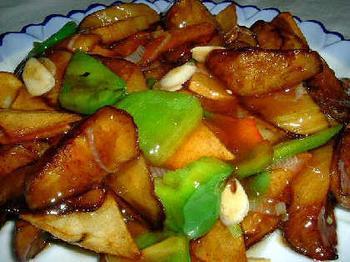 经典的东北菜,色泽金黄,外酥里嫩,酸甜可口。20世纪初,道台府宴请中东铁路官员阿法那西耶夫之时,主厨郑兴文按照俄国人喜欢的酸甜口味,把中国传统的"焦炒肉片"改了口味,并根据烹调方法起名为"锅爆肉",只是后来俄国人发音不准,逐渐传成了"锅包肉"。#p#副标题#e#